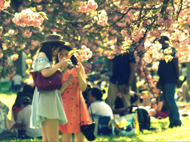 Des groupes de danses, des associations, beaucoup de personnes en costumes traditionnels, des femmes sublimes partout (oui, je suis légèrement sensible au charme asiatique). Des centaines de familles et amis qui déjeunent et se prélassent sous les cerisiers, et là, sous les plus beaux arbres, l’Asso Boyan qui fête le Shangsy avec tout le monde.