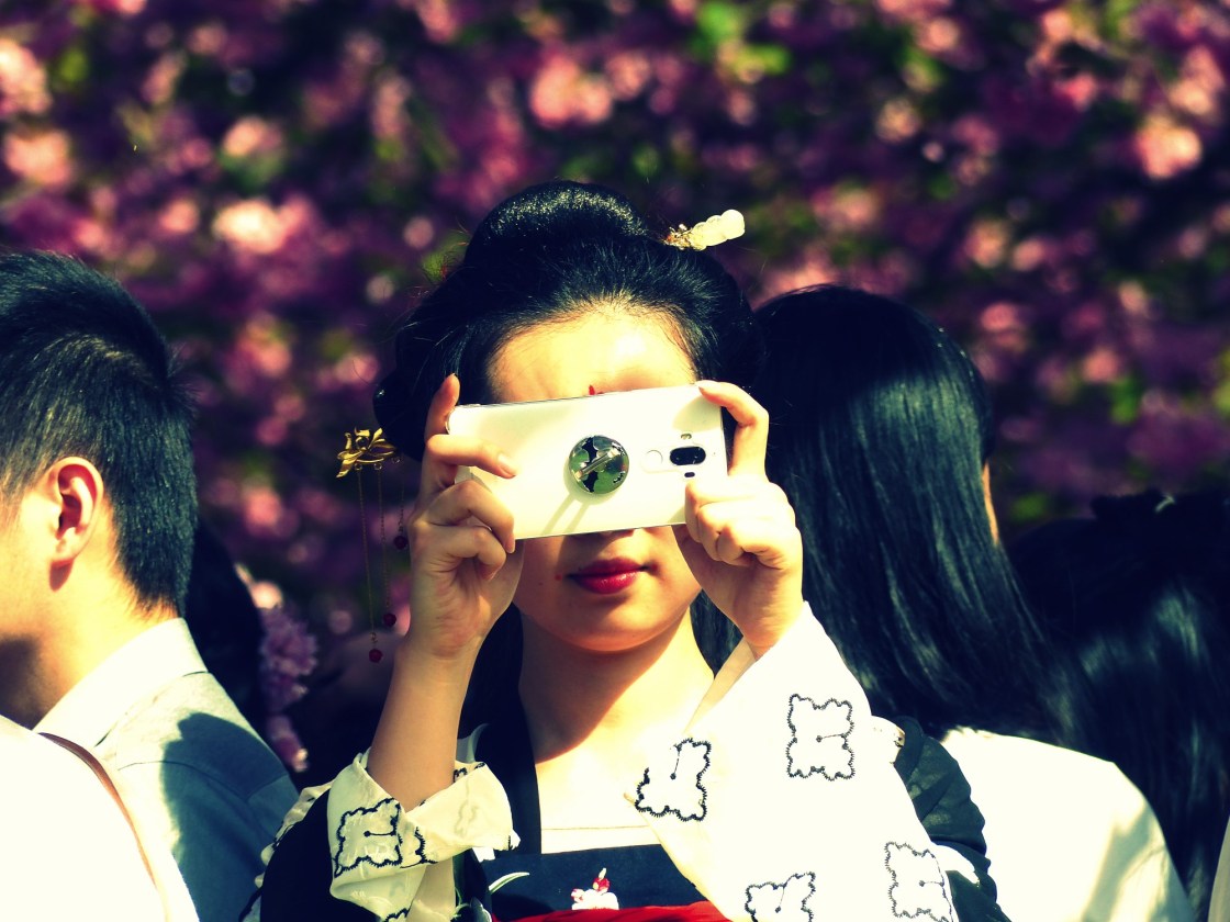 Des groupes de danses, des associations, beaucoup de personnes en costumes traditionnels, des femmes sublimes partout (oui, je suis légèrement sensible au charme asiatique). Des centaines de familles et amis qui déjeunent et se prélassent sous les cerisiers, et là, sous les plus beaux arbres, l’Asso Boyan qui fête le Shangsy avec tout le monde.